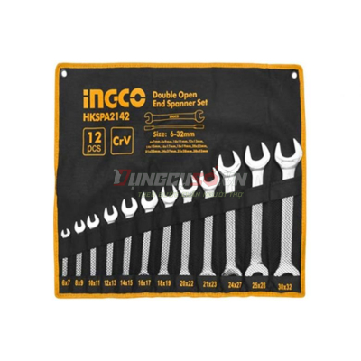Bộ 12 cờ lê hai miệng 6-32mm INGCO HKSPA2142 thuộc loại cờ lê 2 đầu miệng hoặc còn được gọi là cờ lê đầu hở. Trọn đủ bộ bao gồm 12 cây với kích thước nhỏ nhất là 6x7mm và lớn nhất là 30x32mm. Bộ sản phẩm này dùng để hỗ trợ người dùng vặn, siết đai ốc một cách nhanh chóng và hạn chế được những vấn đề không mong muốn như biến dạng đai ốc, đáp ứng tốt cho các nhu cầu sử dụng chuyên nghiệp hay đai ốc cần lực siết, vặn mạnh.