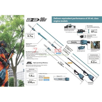 Makita DUA300ZB – máy cưa cành trên cao dùng pin 18V x2, lam 300mm, tốc độ xích 20 m/s, chiều dài máy 2.2m, chuyên dụng cắt cành lớn, cao, không cần thang.